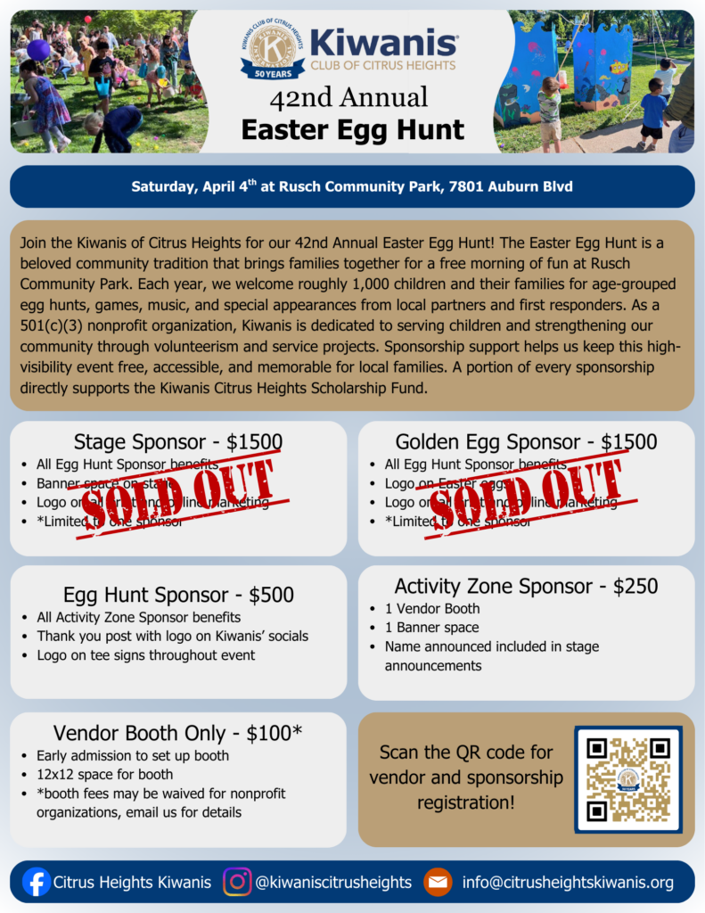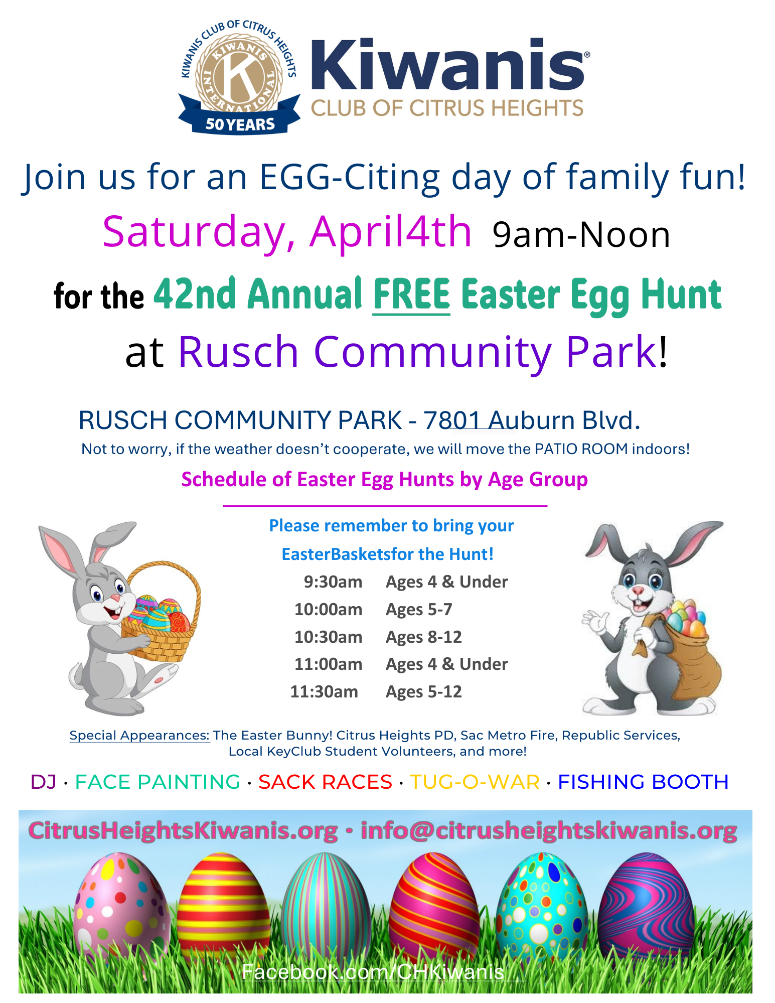 The Kiwanis Club of Citrus Heights is excited to host our 42nd Annual FREE Easter Egg Hunt at Rusch Community Park!