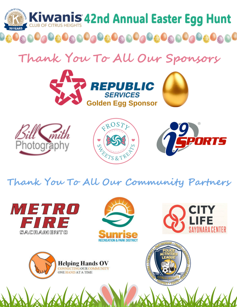 The Kiwanis Club of Citrus Heights would like to extend our sincere appreciation to the incredible organizations and local businesses that help make the 42nd Annual Easter Egg Hunt possible.